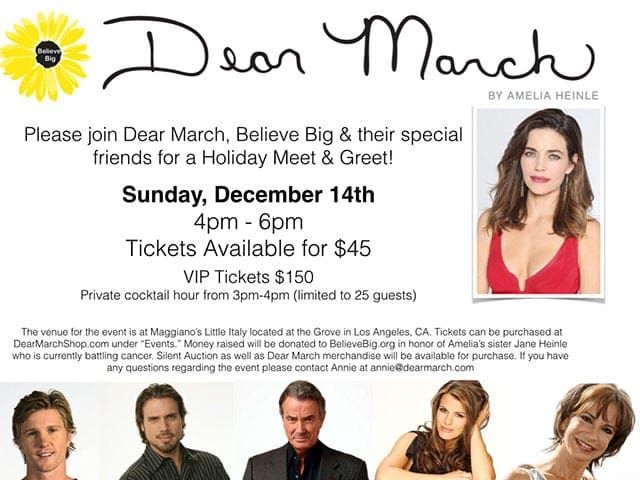 On Sunday, December 14, “The Young and the Restless'” Amelia Heinle (Victoria Newman), along with her new venture DearMarch.com, will be hosting a charity event for BelieveBig.org, a non-profit whose vision is to assist cancer patients and their families discover their pathway to healing. All money raised will be donated to BelieveBig.org in honor of Amelia’s sister, Jane, who is battling cancer. Joining Heinle will be former “Y&R” co-star and real-life husband, Thad Luckinbill (ex-J.T. Hellstrom), along with current co-stars Joshua Morrow (Nicholas Newman), Eric Braeden (Victor Newman), Melissa Claire Egan (Chelsea Newman) and Jess Walton (Jill Abbott), just to name a few.